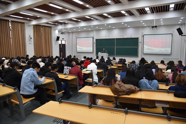 在繁塔楼大教室八举行了宣传贯彻党的十九届四中全会精神专题讲座,院党委副书记牛娟担任主讲,全体2019级研究生参加会议。