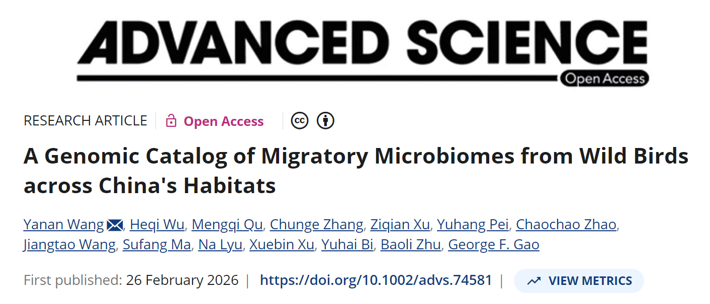 国家动物免疫学国际联合研究中心王亚楠教授在中国科学院一区期刊《Advanced Science》上发表题为“A genomic catalog of migratory microbiomes from wild birds across China’s habitats”的研究论文。该研究通过分析中国11个省份的近600份鸟类肠道微生物组数据(涵盖52个种、10个目),构建了跨境迁徙候鸟肠道微生物参考基因组和基因目录(简称MBGG),包含5823个宏(元)基因组装基因组(MAGs)、13072个质粒序列、44974个病毒基因组,结合精确的(GPS)定位跟踪系统,系统解码了迁徙候鸟肠道微生物的多样性、功能潜力及其在人兽共患病原菌、抗生素耐药性传播中的关键作用,为野生动物健康、疫病监测、生态保护与公共卫生安全提供了权威、开放、可复用的基因组资源,为“One Health”视角下的耐药传播风险评估提供了重要的数据资源支撑。