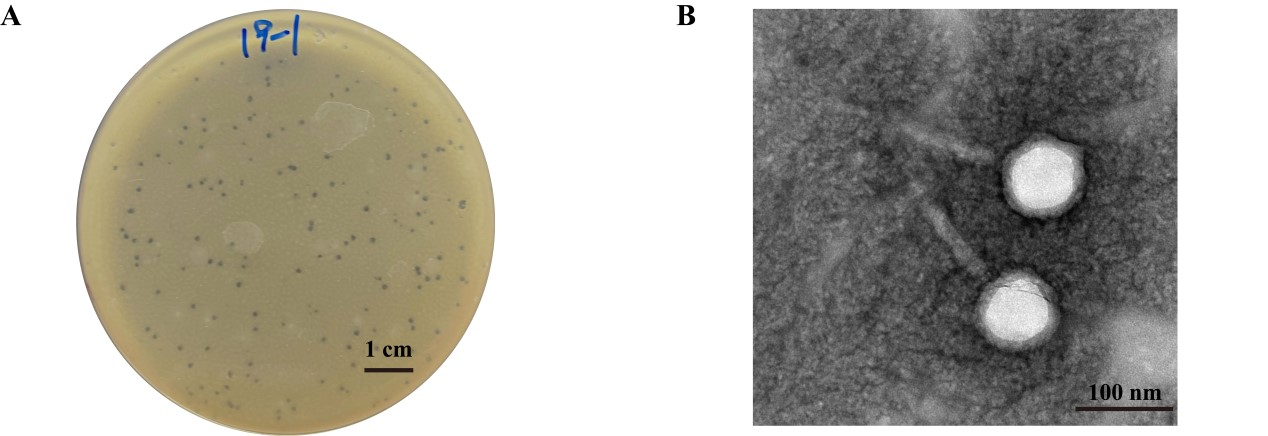 噬菌体作为一种细菌病毒,被认为是细菌的天然捕食者。随着耐药菌株的不断出现,烈性噬菌体被认为是对抗细菌的潜在候选者。此外,噬菌体因其可自我复制、特异性强及副作用小等特性被视为一种可行且有前途的抗菌制剂。当前,噬菌体产品被认为是安全的,已被用于医疗、畜禽业、水产养殖及食品加工等不同的领域。基于此,本课题组分离筛选多重耐药金黄色葡萄球菌,并以此为宿主菌分离纯化获得多重耐药金黄色葡萄球菌噬菌体vB_SaRS_FS19-1(图1),为金黄色葡萄球菌的防控提供新的方案。