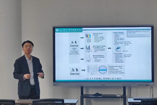 孙子龙教师首先介绍了机体因缺乏运动造成的不良后果,他指出运动是维持和改善机体健康的核心方式,有效运动对骨骼系统、免疫系统、心血管系统、呼吸系统等有效促进作用,而氟污染更是人类不可避免的危害。随后他围绕运动通过多靶点、多通路机制对机体健康产生深远益处展开了详细介绍。最后他分享了小鼠运动模型的成功建立,逐步完善了小鼠跑台运动1.0到小鼠滑轮运动3.0模型,并对目前正在开展及以取得成果的运动相关科研工作和进展做了详细介绍。