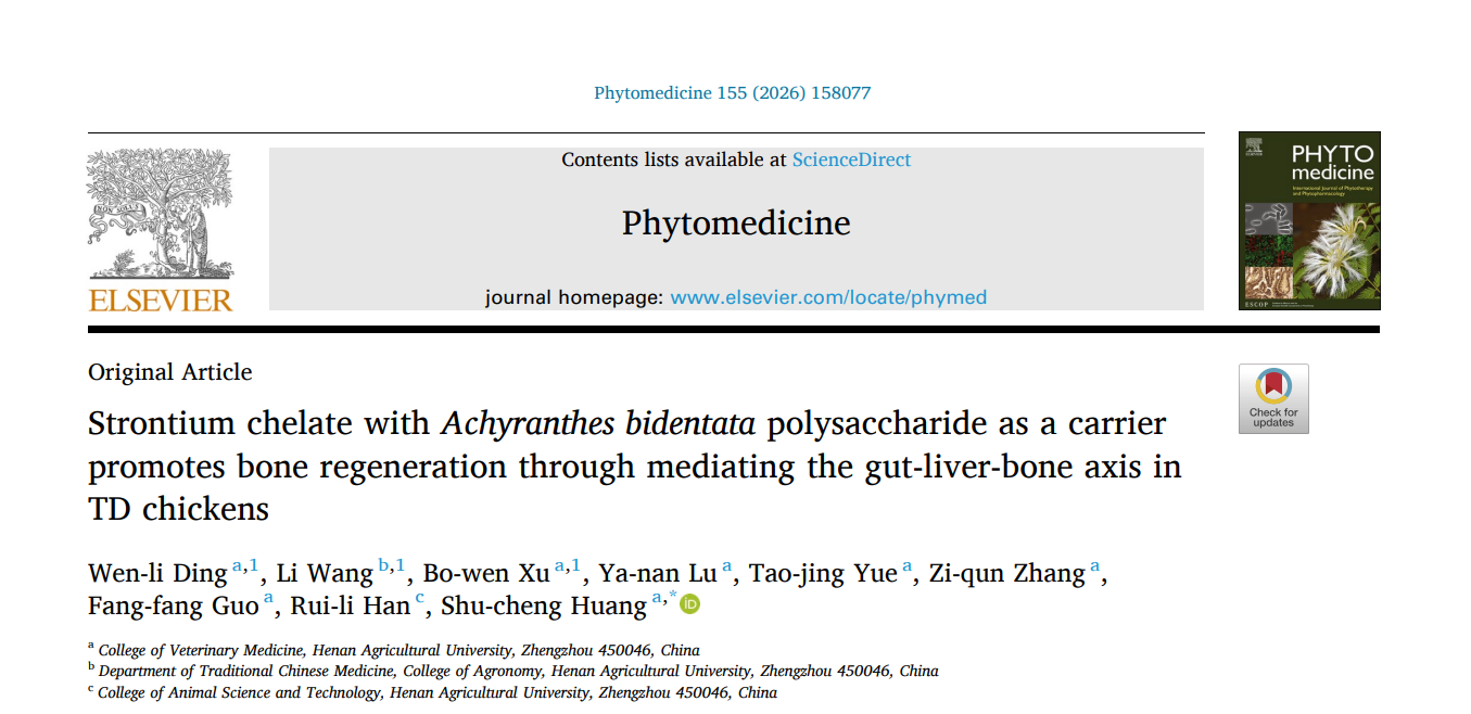 黄淑成副教授课题组,在中药药理学领域国际期刊《Phytomedicine》在线发表题为《Strontium chelate with Achyranthes bidentata polysaccharide as a carrier promotes bone regeneration through mediating the gut-liver-bone axis in TD chickens》的研究论文。该研究从肠-肝-骨轴视角系统阐明了牛膝多糖-锶螯合物修复肉鸡胫骨软骨发育不良(TD)的调控机制,为家禽骨病绿色防控及功能性饲料添加剂研发提供了理论依据与技术支撑。