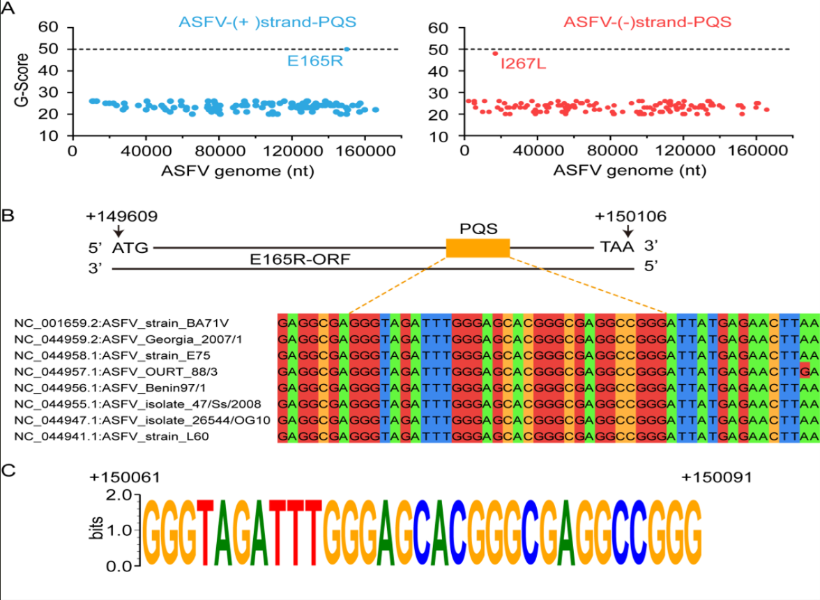 非洲猪瘟(ASF)是一种对猪高传染性、高致死性的重大传染病,给全球养猪业造成了巨大的经济损失。目前,尚无有效的疫苗或药物可以控制ASF感染和传播。发掘药物靶点对研制新型抗病毒药物具有重要意义。核酸G-四链体结构(G4)是由富含鸟嘌呤碱基的DNA或者RNA形成的非典型二级结构,该结构可以调节DNA复制、RNA转录、蛋白翻译等重要生命过程。近年来发现很多病毒基因组中也存在G4结构。