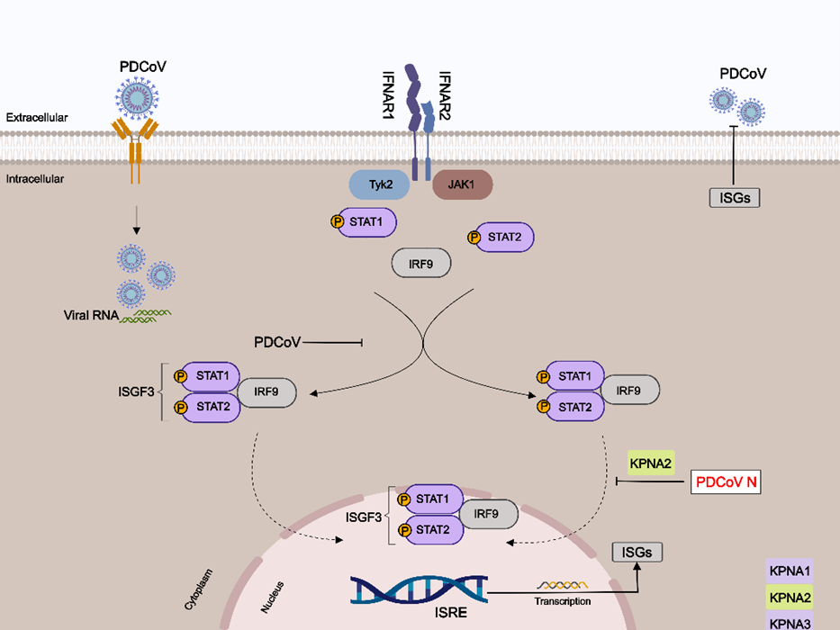 猪δ冠状病毒(PDCoV)是一种新型的肠道致病性冠状病毒,属于冠状病毒科德尔塔冠状病毒属,PDCoV感染的典型临床症状是仔猪急性和严重的水样腹泻、呕吐和脱水,已引起人们的广泛关注,严重威胁着养猪业和公众健康。了解PDCoV在感染过程中逃避宿主防御的潜在免疫机制,对于开发针对PDCoV的靶向药物和有效疫苗至关重要。在宿主固有免疫系统对抗病毒入侵的过程中,I型IFN介导的JAK-STAT信号通路起着至关重要的作用。同时,为了拮抗宿主的抗病毒反应,许多病毒进化出不同的策略来对抗I型IFN诱导的JAK-STAT信号转导。